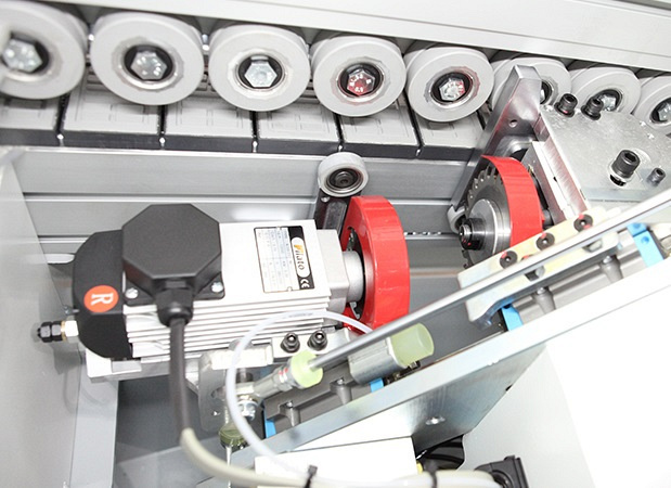 ![]() | Пресс группа Приводной ролик, диаметром 100 мм охлаждает кромку после нанесения клея. Скорость вращения синхронизирована со скоростью подачи конвейера.3 стальных дожимных ролика диаметром 68 мм.Два ролика - конусные с противоположным углом наклона, для поджима кромки и минимизации клеевого шва.Один ролик - цилиндрический, для финишного дожима кромки перед обработкой. |