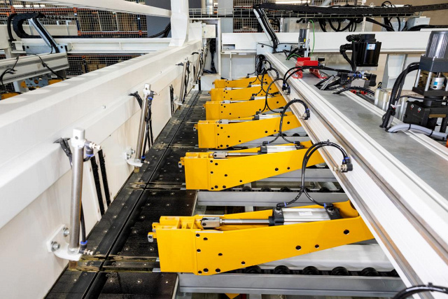![]() | Двойные толкатели 2 крайних двухпальцевых захвата имеют собственную систему привода и могут работать независимо от основного толкателя и 4 шт. сервоприводных захвата, автоматически регулируют положение зажима в соответствии с обработкой, обеспечивают надежное зажатие панели. Применение Twin Pusher позволяет увеличить скорость распила на вторых резах до 30%. Привод основного толкателя - серводвигатель мощностью 2 кВт, позволяющий плавно и быстро перемещать пачку до 7 листов 16мм материала. |