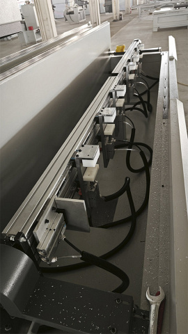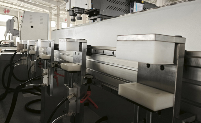 Заготовка устанавливается на подвижные зажимы, которые перемещаются по направляющим. Фиксация заготовки осуществляется при помощи пневмоцилиндров.