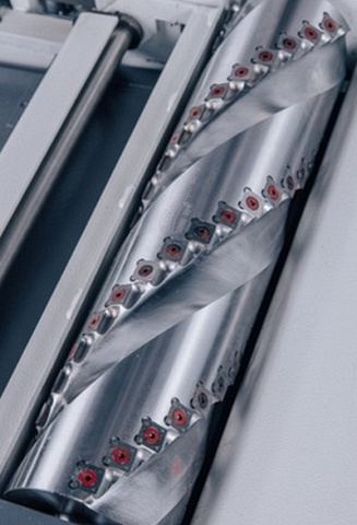 Имеет 3 ряда твердосплавных пластин по 29 шт. в каждом. Ножевые пластины расположены по спирали. Это обеспечивает плавный вход ножей в заготовку и исключает ее подрывы, что повышает качество обработанной поверхности.