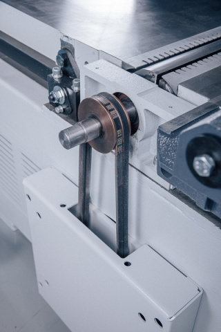 Посредством клиноременной передачи через 2 ремня. Ножевой вал оснащен электродинамическим торможением двигателя в соответствии с нормами ЕС. Полная остановка вала не более 10 сек.