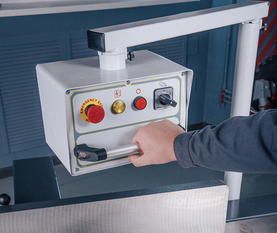 Вынесенный на уровне глаз пульт управления с кнопками включения и аварийной остановки. Установлен на поворотной консоли, что позволяет вращать и устанавливать пульт в удобном для оператора месте. Легкий и удобный доступ к электрокомпонентам в пульте.