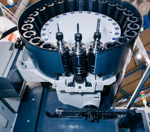 Станок оснащен системой автоматической смены инструмента манипуляторного типа. Это позволяет сократить вспомогательное время на смену инструмента при обработке сложных изделий, для изготовления которых требуется от 20 и более различных инструментов.