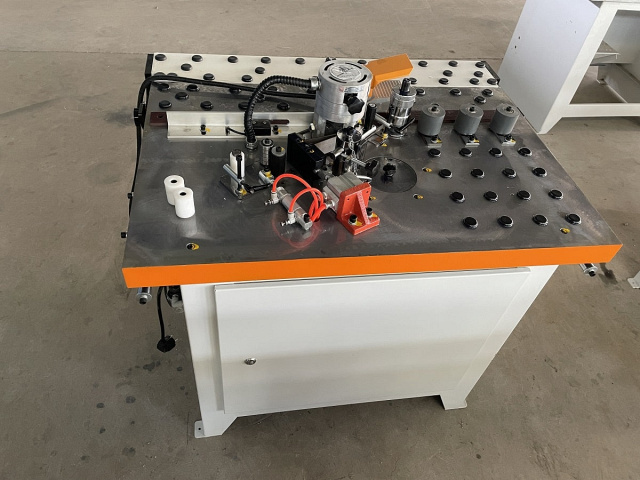 Станок оснащён дополнительным столом, который создает условия для комфортной работы с крупногабаритными деталями. Стол имеет возможность поворота под 45 градусов, за счет чего станок может приклеивать кромочный материал на заготовки со скошенным торцом.