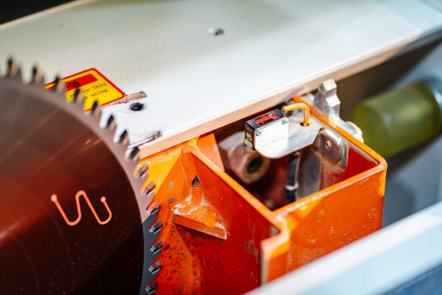 Привод пильной каретки мощностью 2 кВт позволяет разгонять её при ходе до 90 м/мин, а при холостом ходе – до 120 м/мин. Вылет основной пилы контролируется системой ЧПУ и зависит от высоты распиливаемого пакета материала. Система быстрой смены основной пилы проста и удобна для оператора.