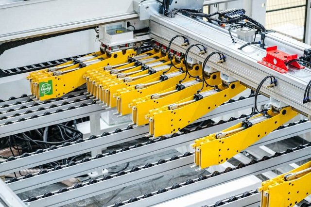 На толкателе расположено 12 пневматических захватов. 2 крайних двухпальцевых захвата имеют собственную систему привода и могут работать независимо от основного толкателя.