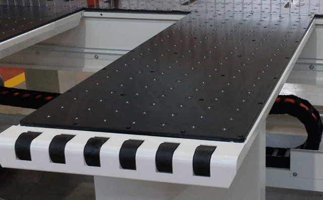 Основа рабочего стола — стальной лист, толщиной 20 мм, что гарантирует отсутствие прогибов и абсолютную ровность опорной поверхности. Поверхность рабочего и загрузочных столов оснащена системой воздушного поддува и позволяет перемещать пакеты заготовок до 7 листов без повреждения лицевых поверхностей.