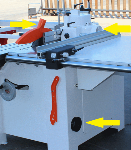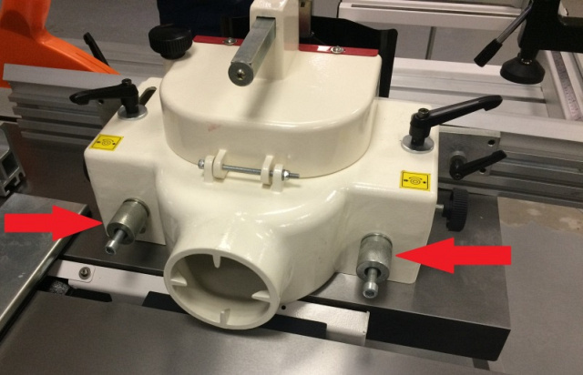![]() | Маховики регулировки Регулировка подъема/опускания фрезерного шпинделя и пильного узла, а также угла наклона пильного узла осуществляется алюминиевыми маховиками. |