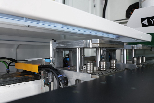 Вертикальные независимые пневматические прижимы (пластины и ролики) надежно фиксируют деталь во время обработки. Если во время обработки происходит движение детали (торцевое сверление, выборка паза, фрезерная обработка) – используются пневматические роликовые прижимы.